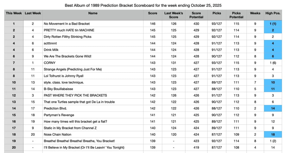 WE HAVE A NEW NUMBER ONE BRACKET! That’s right, after hanging on in the top 5 (or thereabouts) for 8 weeks, in week 9, No Movement In a Bad Bracket has taken the top spot. Congrats! Furthermore, PRETTY much HATE tin MACHINE moves up two spots to a new high of #2, and Dirty Rotten Filthy Stinking Picks is right there with it. This leaves the #3 spot to #4, which is also tied, between sctttnnnt and Drink Milk, which is also their highest position in the chart so far.