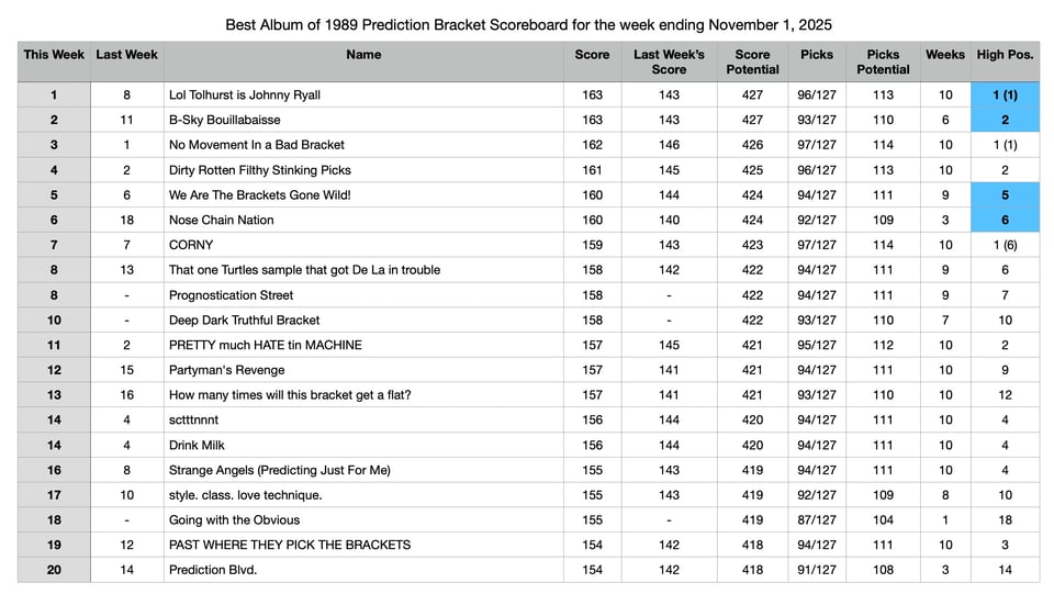 There was only one upset this week, but major changes happened on the Prediction Bracket chart, suggesting that that one upset was pretty important. Last week’s new #1, No Movement In a Bad Bracket, dropped to #3, and the top two are brand new to the top 5. B-Sky Bouillabaisse rockets up 9 notches to #2, and Lol Tolhurst is Johnny Ryall, last week #8, leaps over everyone else to become the newest #1 bracket.