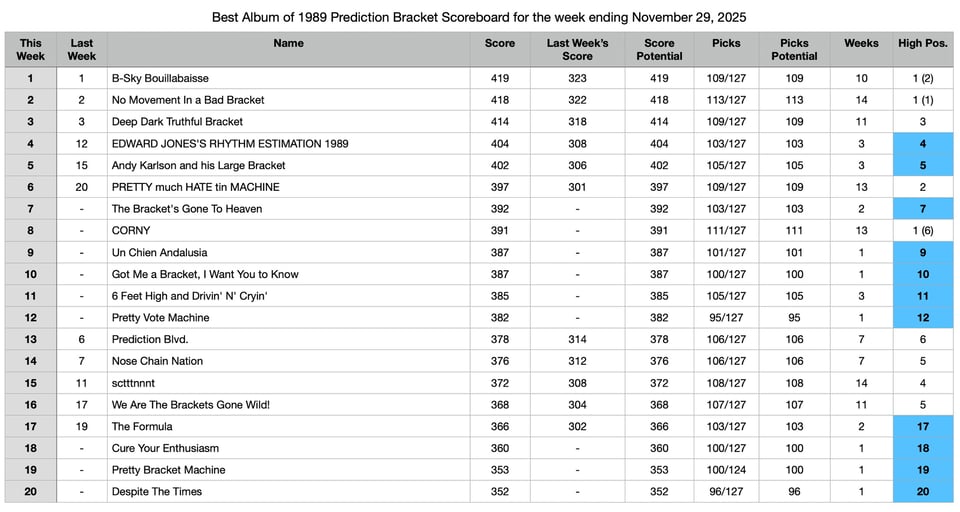 Congrats to B-Sky Bouillabaisse, number one for a second week! Numbers two and three, No Movement In a Bad Bracket and Deep Dark Truthful Bracket, also remain the same from last week. Big moves from EDWARD JONES'S RHYTHM ESTIMATION 1989 (up 8 to #4), Andy Karison and his Large Bracket (up 10 to #5) and PRETTY much HATE tin MACHINE (up 14! to #6). Debuting this week are Despite The Times (#20), Pretty Bracket Machine (#19), Cure Your Enthusiasm (#18), Pretty Vote Machine (#12), Got Me a Bracket, I Want You to Know (#10) and Un Chien Andalusia (#9). Re-debuting are 6 Feet High and Drivin' N' Cryin’ (#11, last seen week #6) and The Bracket's Gone To Heaven (#7, last seen week #12). Glad you could make it back!