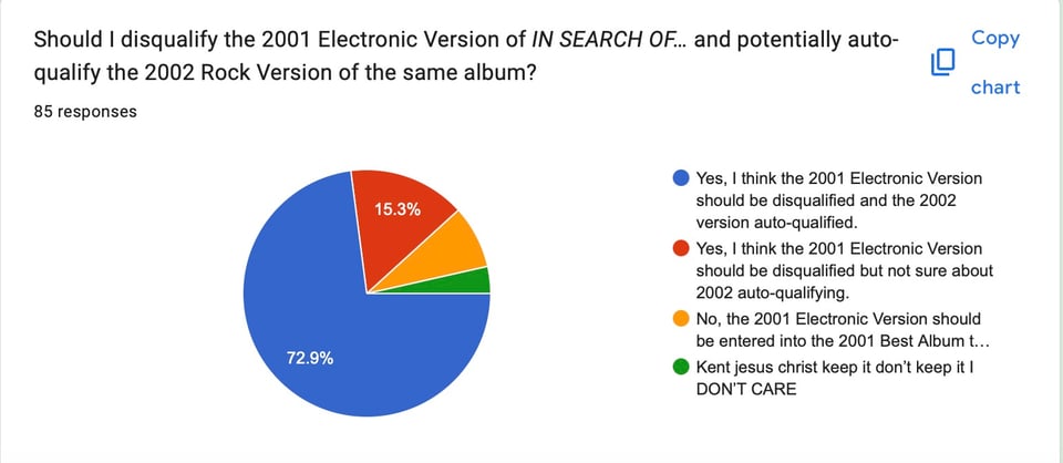 Last week, I presented a difficulty with the inclusion of N*E*R*D’s album IN SEARCH OF… into the Best Album of 2001 tournament. The short version: the only qualifying version of that album, known as the Electronic Version, is not available on any U.S. streaming service and, far as I can tell, only exists on a stranger’s Google drive. I wanted to disqualify it from 2001, but, since that’s a heavy-handed move, I then wanted to auto-qualify the 2002 version (the “Rock Vesion”) for the eventual 2002 tournament. But before doing that, I wanted your feedback first. I gave you four options to vote for: a) disqualify for 2001 and auto-qualify for 2002, b) disqualify for 2001 and hold up on the auto-qualifying I mean let’s not go crazy, c) enter it into the 2001 tournament, or d) for “don’t care.” I also noted that while the results wouldn’t be binding, if there was a majority consensus, I would lean towards it. Here are the results:
