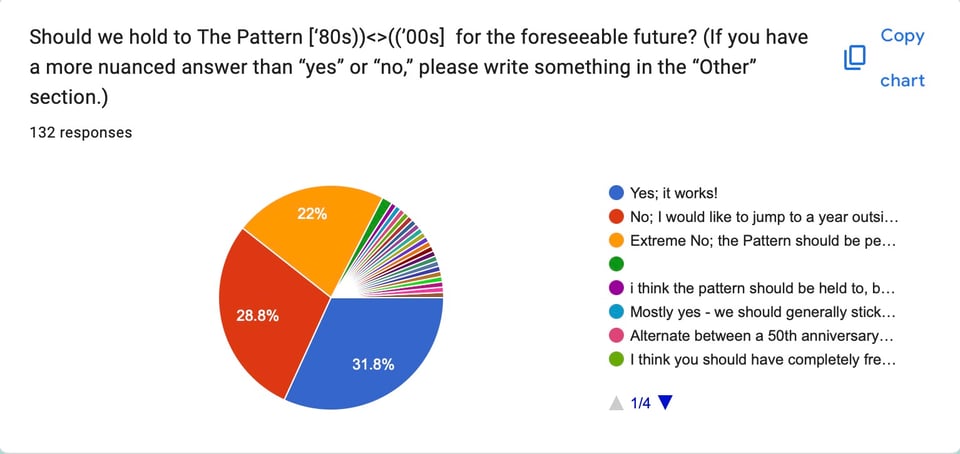 No; I would like to jump to a year outside The Pattern sometime soon. 28.8% (38 votes)