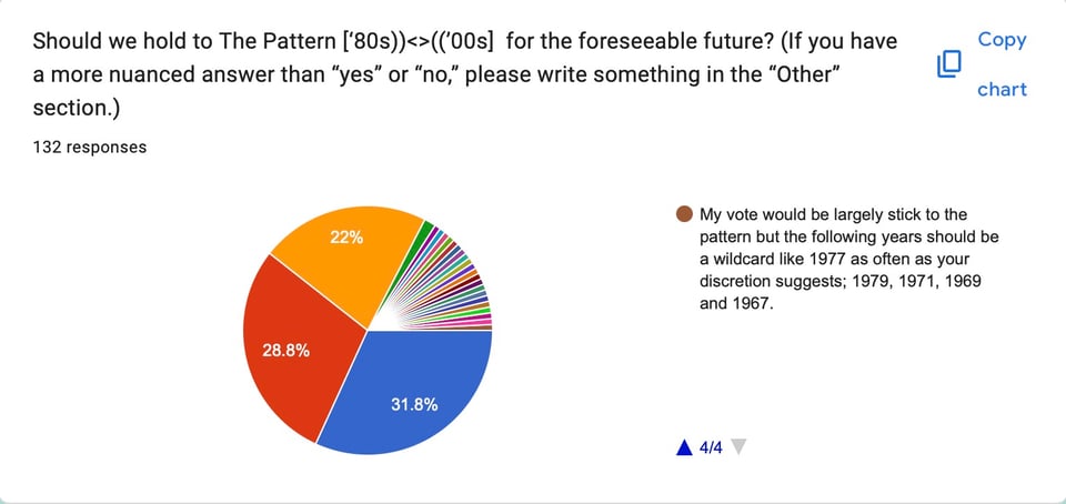 I sort of like the idea somewhat reflected in the next question - that the pattern continue similarly, but an occasional "wild-card year" be thrown in?