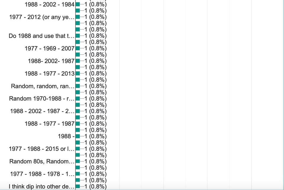 Ok, i'm looking at these answers and i think im gonna have to say other / i dont care on all of them. Id rather just be given a year and have to grapple with the ins and outs of that year instead of complaining we didnt get a different year. So honestly, whatever you want to do. But like i personally wouldnt weigh the results of this poll, too hard / at all. Thanks for everything as always.