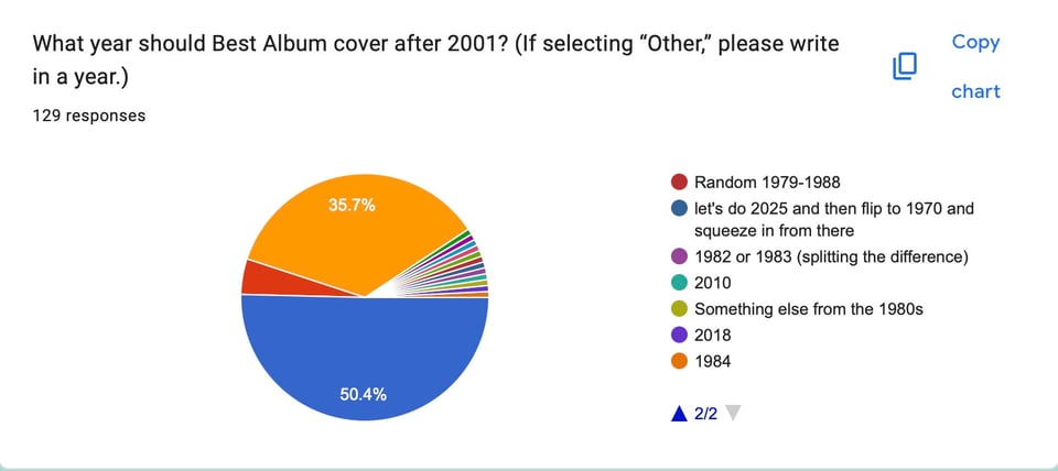 I started university in 1987, so I'm fond of 80s polls. There seems to be a lot of classic album years there. Any year excluding Duran Duran would be great. 1980 amd 1987 look competitive. Enjoy the tunes. Thanks.