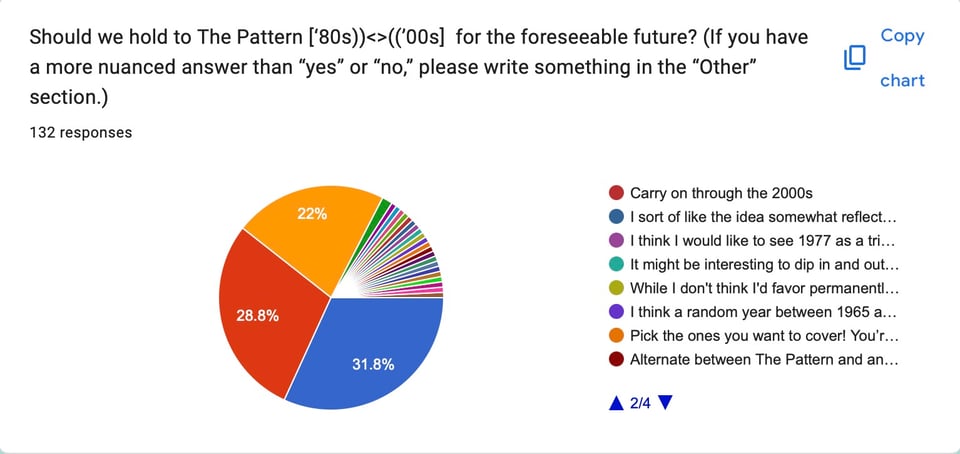 I'm voting to stick to the pattern. This despite the fact that I don't like 80's music and really enjoy 70's music. Why? Because this tourney forces me to engage with a decade of music I would not otherwise in my personal life. (I love 70's and 2000's music and listen to it on my own anyway.)