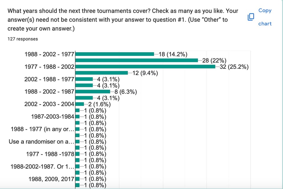 That said, I have made one definite decision, which I announced Bluesky: the next tournament year will be 1988. This is, of course, the year I would’ve chosen without any survey, and the survey results only strengthened that choice. I apologize to anyone who assumed that we were doing 1988 and was thrown in a tizzy when I said Hold up, let’s do a survey first. Your work was not in vain!
