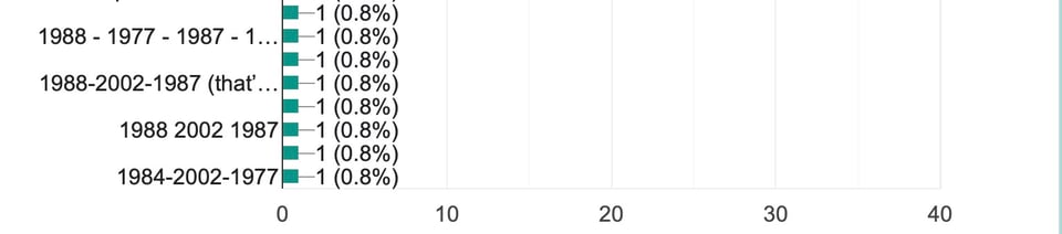 (This chart is pretty much impossible to glean exact results from because Google Forms is kind of mostly terrible, but I clarify the data below. Your eyes are not deceiving you — every other line is unlabeled. At Google Forms, UI design is our passion.)