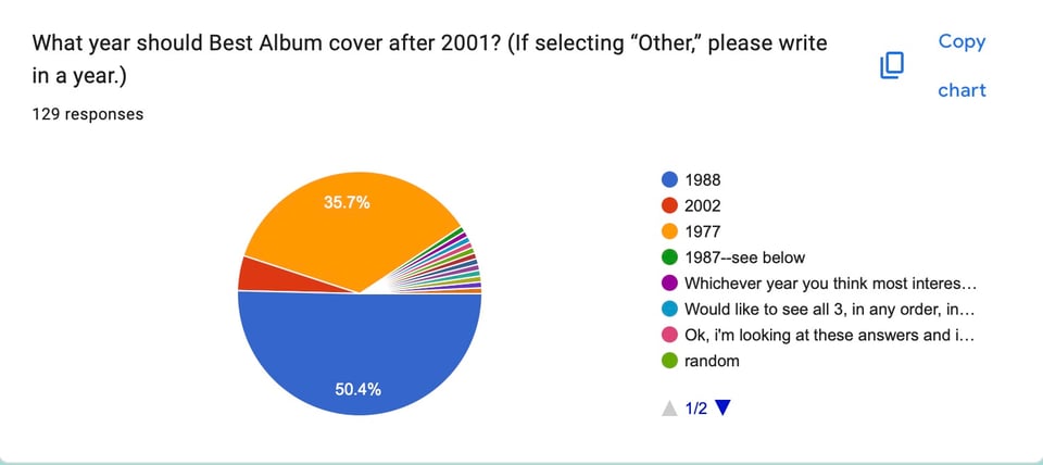 A couple weeks ago, I put up a survey asking for your input about what year Best Album should do next, what the next three should maybe be, and if we should continue the back and forth pattern we’ve been using all this time to determine a Best Album year. Below, you’ll find the results of that survey. I have a number of ideas of where to go based on these results, but I’d like you to look at the data and discuss it with me and each other before I decide on anything definite.