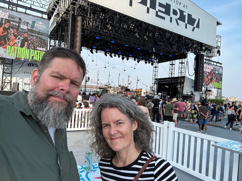 We went to see the Mountain Goats on Monday. They played a number of our favorite songs, and the concert venue was beautiful. The stage was on top of the rooftop of one of the piers, with the Brooklyn Bridge right behind the stage. We got tickets to the old people section, and we were delighted that the concern was over and we were home by 9:00 PM.