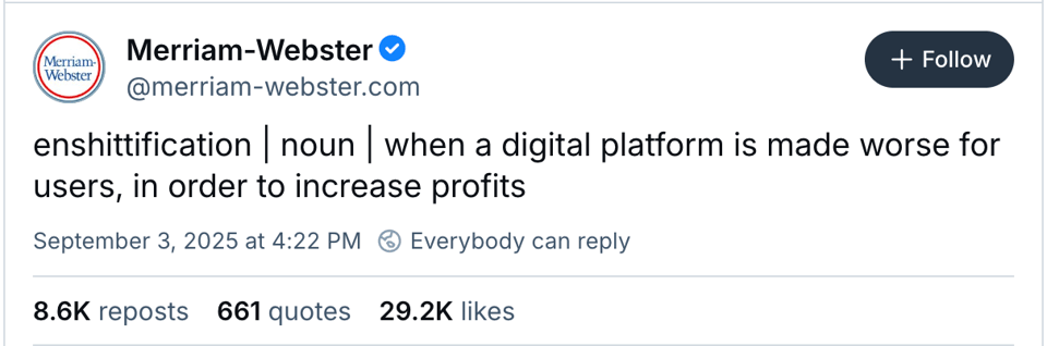 The Merriam-Webster Dictionary made the rounds this week with their definition of the word enshittification—“when a digital platform is made worse for users, in order to increase profits.” It is a hallmark of these times. It adequately describes our priorities as a country, and as the technology industry. The Web is feeling like a rundown neighborhood, desperately in need of some diversification of thought and incentives behind Internet technology.