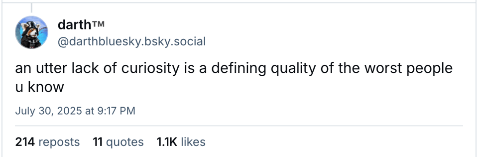 I saw a Bluesky post from Darth this week that resembles what I’ve been feeling about people who have all the power right now. I think a lack of curiosity is what is at the heart of the rot that is spreading across the United States right now. A lack of curiosity is why AI seems like the answer to so many trapped in their privileged isolation.
