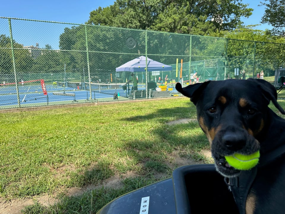 After getting back on our daily ride we pulled over on the upper west side and cased the tennis courts. There were hundreds of tennis balls up against the inside of the fence—blowing Poppy’s mind. We managed to find a tennis ball that had made it’s way over the fence and was free to grab on the ground.