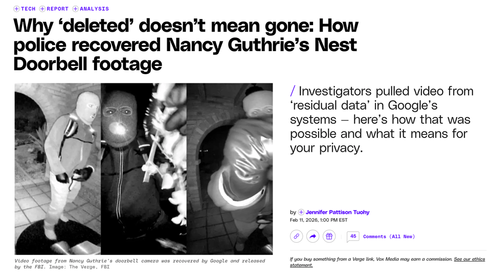 The story of why ‘deleted’ doesn’t mean gone: How police recovered Nancy Guthrie’s doorbell footage is disturbing as all hell. The way that all our nightmares of digital technology seem to be coming true in such very dystopian ways should give us pause regarding any technology we let into our homes, schools, and places of business, making sure it truly benefits us.