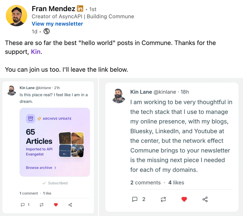 I signed up for my friend’s newsletter centered social network. It is positioned as an alternative to Substack. Which I have managed to avoid altogether. I’ve abandoned Twitter and avoided Substack for same reasons, and while I am finding some light benefit from Bluesky and Mastodon, I am captivated by the power of the newsletter, so Commune has caught my attention for what might be “next”.