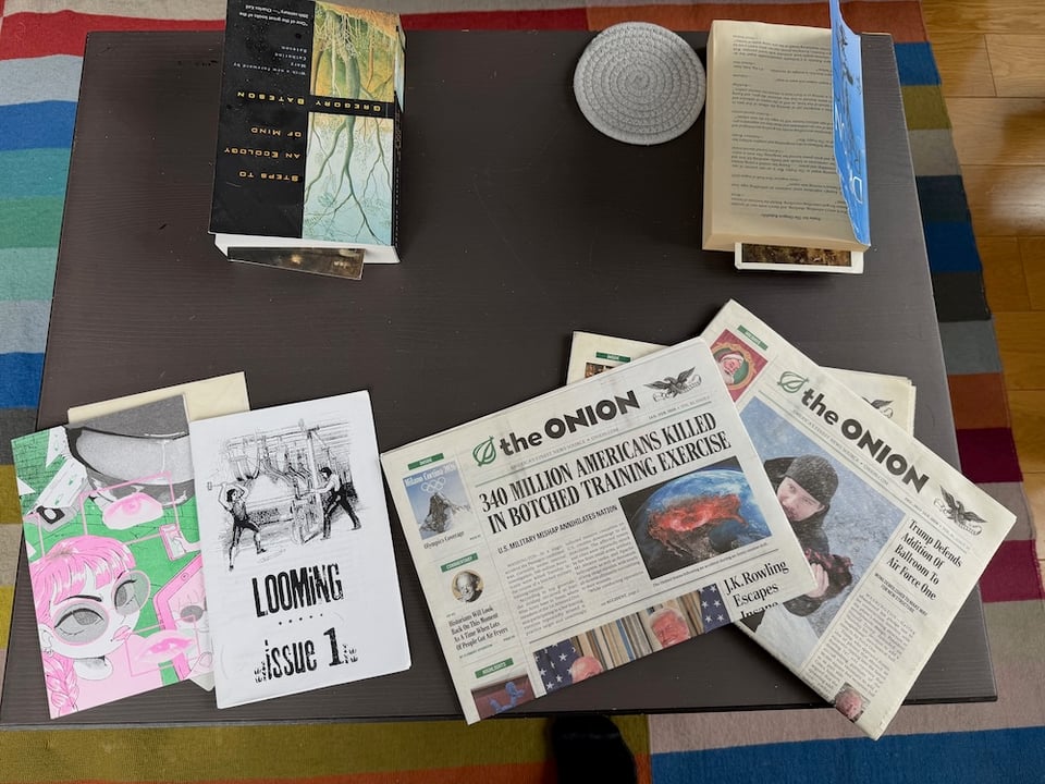 In addition to the books, I am loving the accumulation of Onion newspapers and Zines on our coffee table. I like being able to get stories offline. I miss newspapers and magazines a lot. Event with the digital being much more of a draw. It just feels more special. It isn’t that everything online has lost its value, it just feels like we’ve scaled things too far, and we have lost our ability to assess what truly matters. I hope that we can find ways to connect via local and regional zines, as well as invest in the local and regional news that matters.