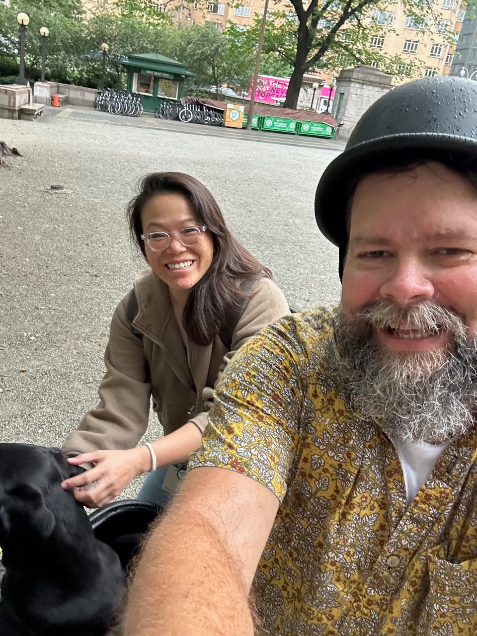 My friend and former boss, coworker, and employee (it’s complicated) from the Postman days (she is no longer there) came to town this week. We met at Columbus Circle in the rain. I was supposed to meet her during our normal walk, but I spaced. So Poppy and I quickly hauled ass back up to the park on the bike. It was good to see her. I really miss working with Joyce and hope we can do it again somewhere sometime.