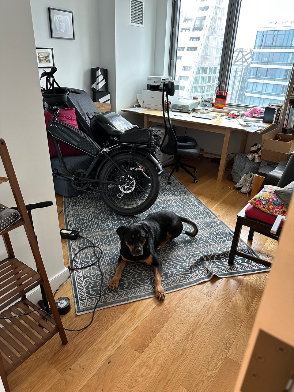 The weather in NYC cooled off this weekend, but during the weekdays things were getting pretty hot—forcing Poppy and I to ride in the morning right after our walks in Central Park. This meant that if we weren’t out the door by 9:00 AM, Poppy R. Lane was laying in front of the bicycle trying to tell me that I need to stop what I am doing and “BIKE”!!