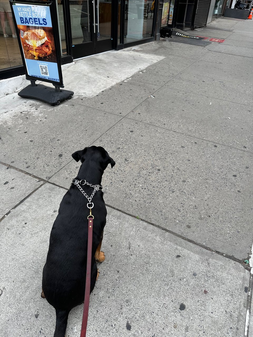 When we walk to Central Park every morning there is sometimes a black Bodega cat sitting out on the sidewalk. Poppy is obsessed with this cat. Even when it is not there she acts like it is, or it wil be any second. We are still unsure if she’d hurt a cat, and she seems to just really want to observe them, but who knows—she is a Rottweiler after all.
