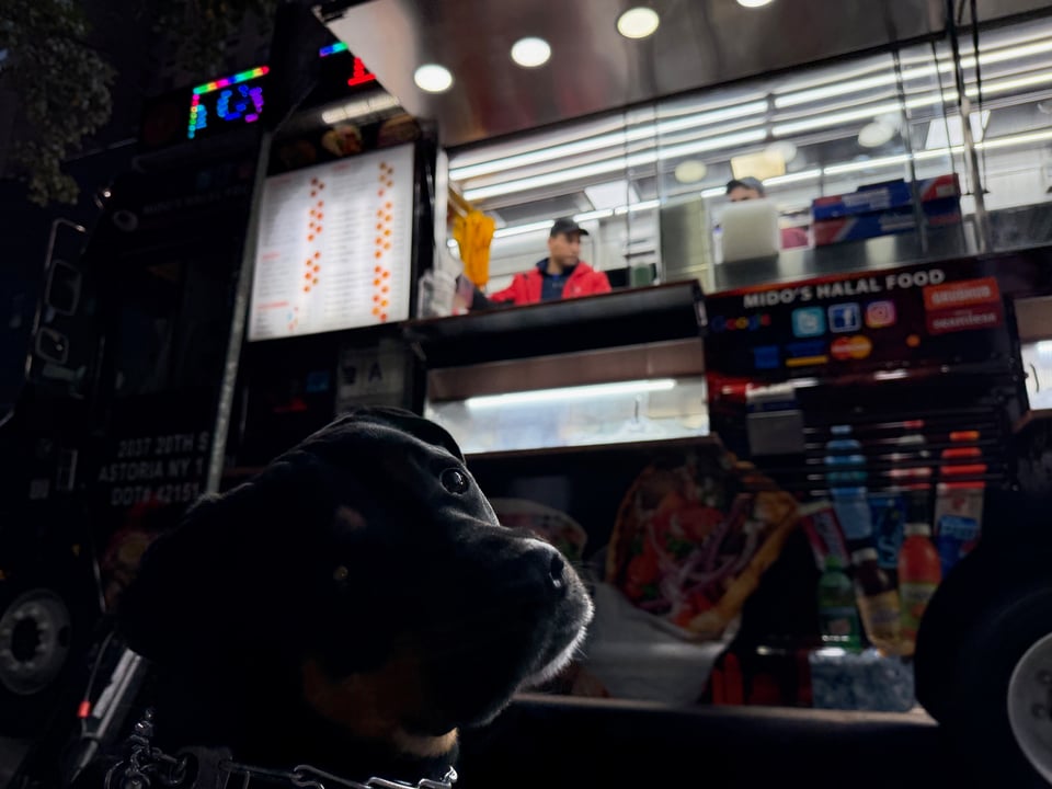 Audrey was out for a talk in Brooklyn one night this week. Facing starvation I took Poppy for a walk to pee, and decided to head up to Mido’s Halal cart on 9th & 58th. It is the best Halal in the city. It is always amazing. It gave Poppy and I a chance to stalk a couple neighborhood bodega cats before we made our way home to eat some delicious chicken and rice.