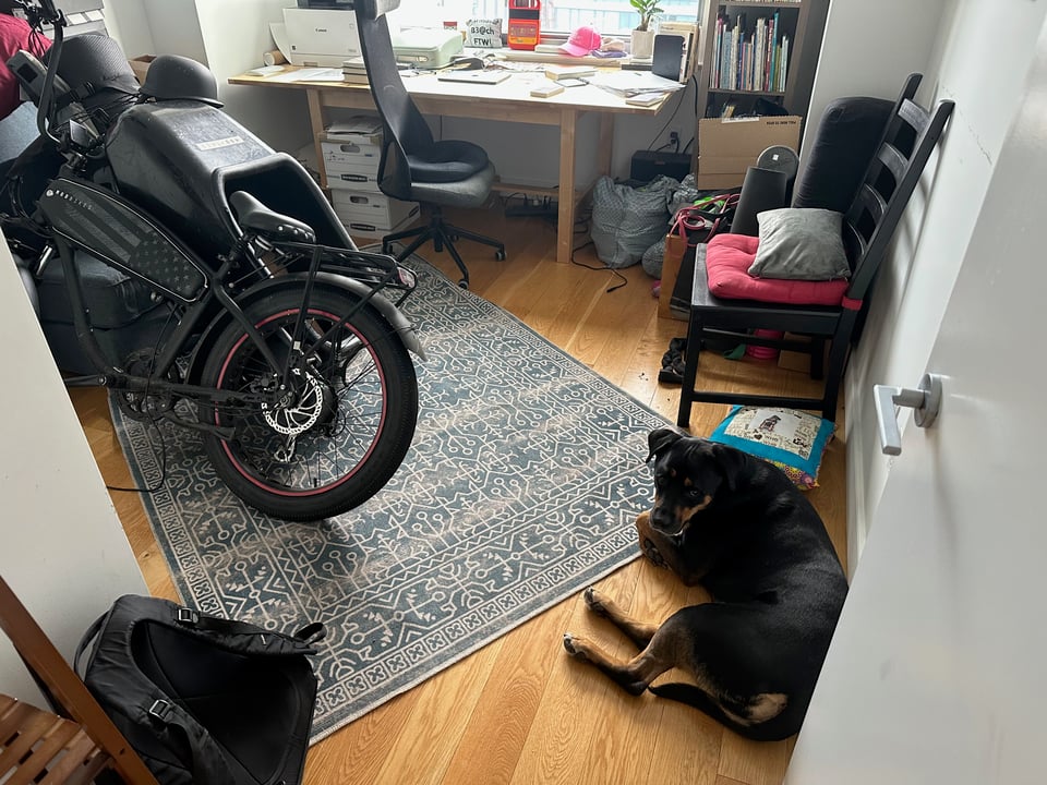 My work weeks are starting to get busier, and occasionally I have to take calls between 8:30 AM at 11:00 AM in the morning. Something I will have to juggle more often as we come out of summer into a busier time of year. Trying to explain to an 85 lb Rottweiler who operates on a schedule that we have to wait a few hours to go for a ride in the park is not the easiest thing to do. This morning we waited to go on a ride until Audrey got back from her race, and Poppy kept asking me to go directly, only to take a break lying next to the bike in the office.