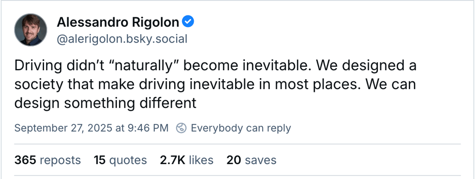 This all left me receptive to a post on Bluesky from Alessandro Rigolon, associate professor of urban planning, “driving didn’t “naturally” become inevitable. We designed a society that make driving inevitable in most places. We can design something different.” Agreed. I believe we can design something different when it comes to artificial intelligence.