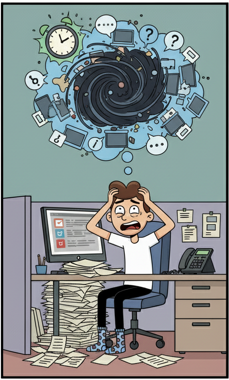 Working-memory load: context scattered across chat, decks, and hallway promises. Rebuilding requires constant energy.