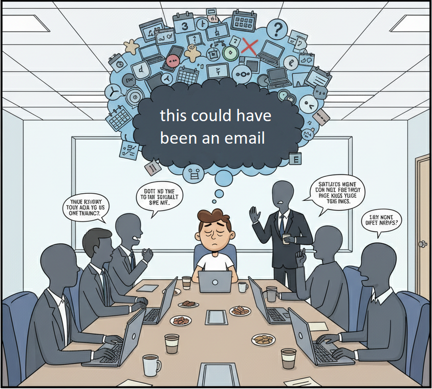 a) Baseline the fog. Skim one week of meetings. Count: with agenda, without, decisions recorded, owner named.