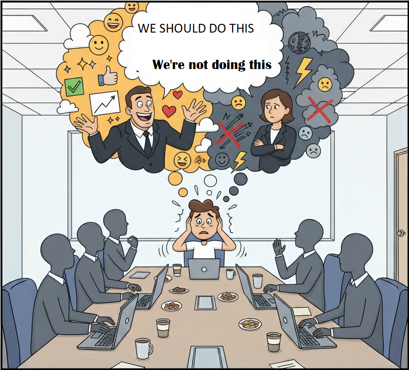 The Echo — an idea is repeated but with volume. The loudest at the table reflects and amplifies the one with most charisma. Smaller voices dissipate in the cacophony. Volume masquerades as wisdom.