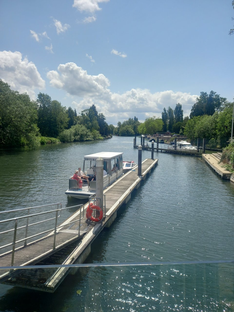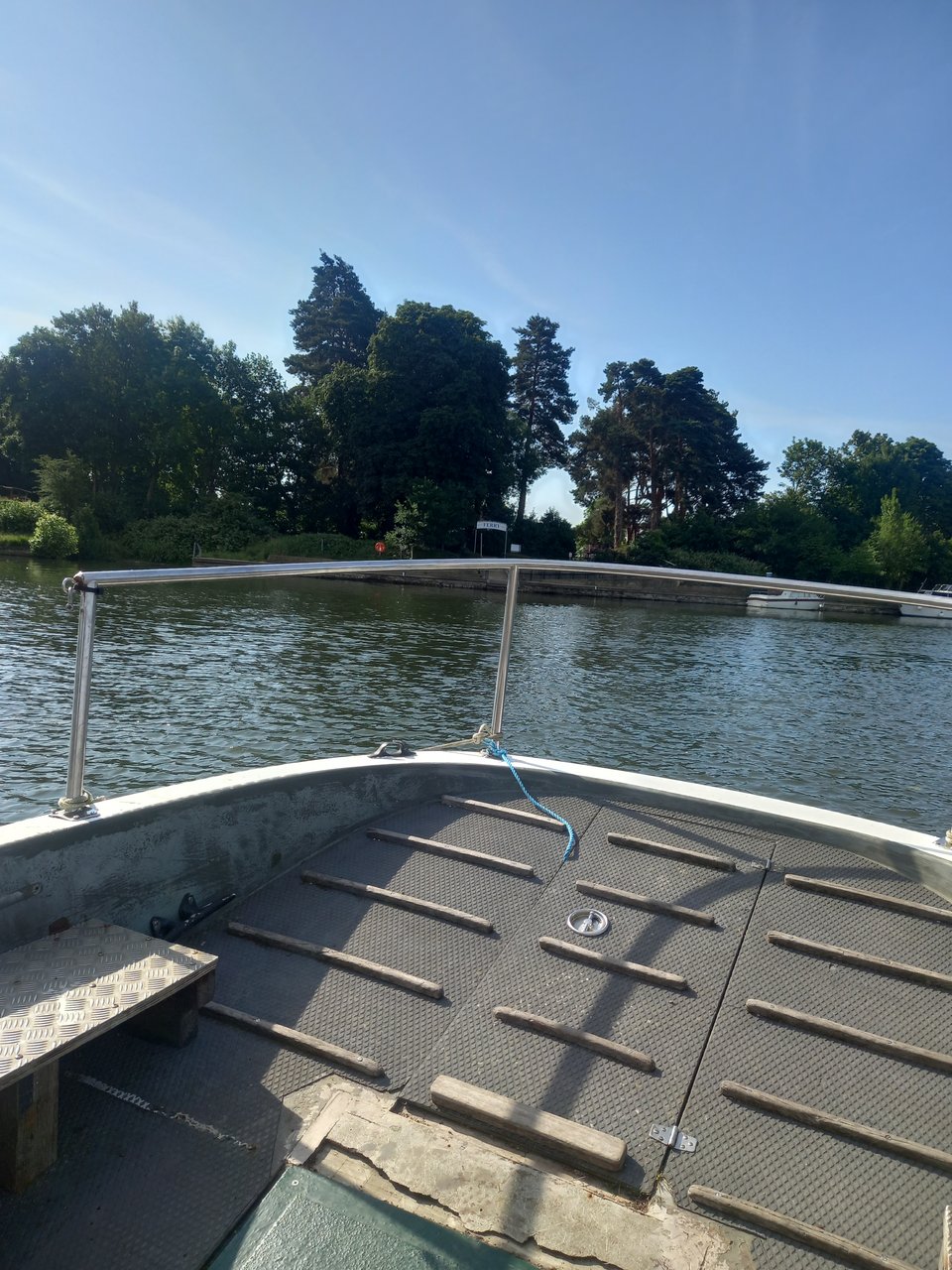 Just downstream of Shepperton lock is the only official ferry crossing of the trail, the Shepperton-to-Weybridge ferry. The guidebook says it's summoned by ringing the bell, but when I hesitated for a moment by the dock, the ferryman saw and approached me. It's a ridiculously brief journey, but still rather exciting to be on the water once again rather than beside or above it.