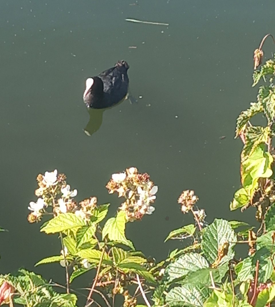 I took a rest and laundry day, partly because I'd run out of clean underwear but partly to put off the moment when I had to pack up my tent for the last time. When the dreaded moment finally arrived, I aired my tent for as long as possible before finally conceding the inevitable. I felt a little mournful as I left the campsite behind me, but the path soon brought new sights to take my mind off it. Even inside the M25, there's space for nature reserves, and I spotted what I'm pretty sure was a coot swimming close to the bank.