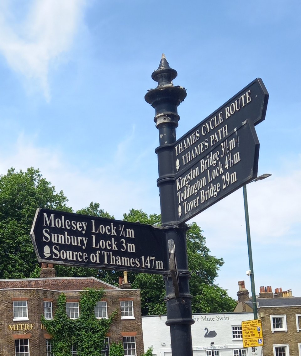 I had my lunch at Molesey lock, trying not to think that this was my last lock lunch. Then I crossed Hampton Court Bridge and came into the Borough of Richmond-upon-Thames, my first official step into London. As if to underline how close I was to the end, the signpost pointing back the way I had come included the distance to the source as well as to the last two locks.