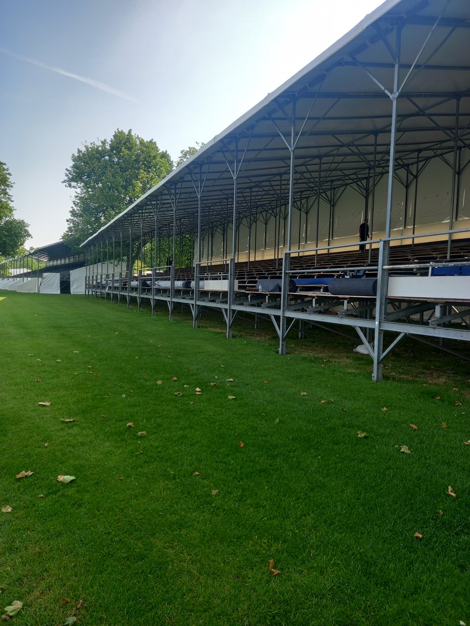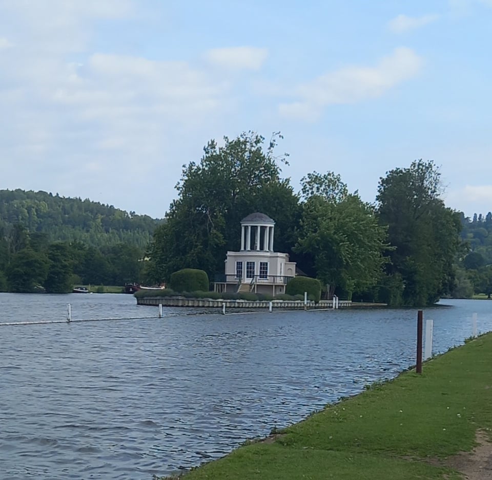 I made an early start the next morning, catching the bus back into Henley to pick up the trail. I passed the Regatta preparations as I headed up towards Temple Island, location of an odd little ornamental temple, and the starting point of the Regatta course.