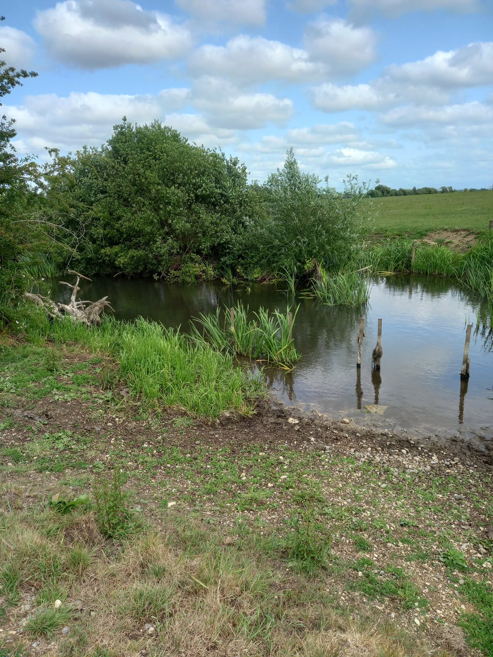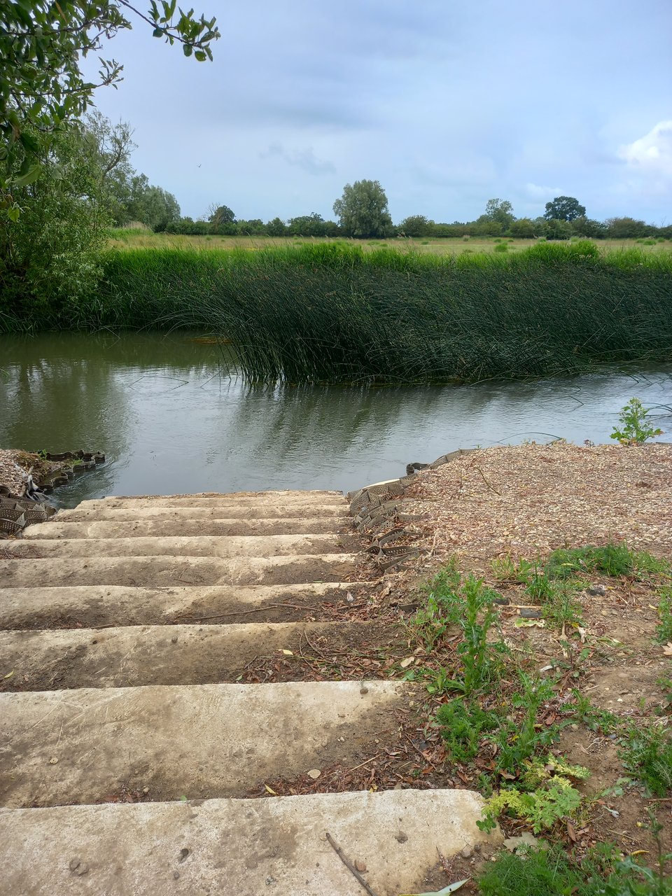 I made a slow start on the second day. I was awake by seven, but I delayed my departure until I'd had a chance to call campsites - pointless in the end because they weren't answering. I also used the time to complete a writing challenge sitting on the steps near the river, now definitely a river but still gentle and rural.