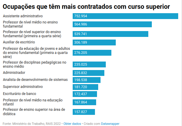 Se formos ver quais são as ocupações em que suas carteiras estão assinadas, entende-se o motivo. Doze ocupações concentram mais de um terço dos trabalhadores no setor formal que completaram ao menos uma graduação.
