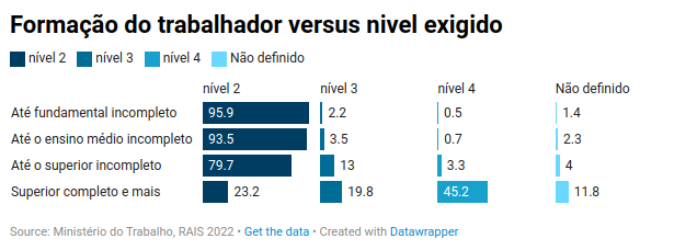 Assim se dividiam, por qualificação necessária e escolaridade efetiva do trabalhador, as vagas formais ocupadas no Brasil em 2022:
