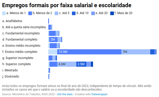 Ou seja, cada barra dá 100% daquela faixa de escolaridade. Sejam os 26 milhões de trabalhadores com ensino médio completo ou os menos de 200 mil trabalhadores de carteira assinada que têm doutorado.