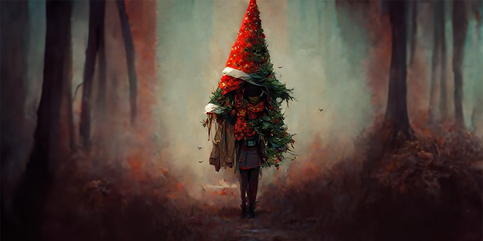 ”Den konformade toppen var ett märkligt mischmasch av täta granvippor och rött kräppapper i lager på lager. I nederkant hängde ett trassel av julklappssnören som släpade i marken. Där skymtade även en kjol, som sannerligen sett bättre dagar, och från oredan stack slutligen två pinnsmala ben fram.”