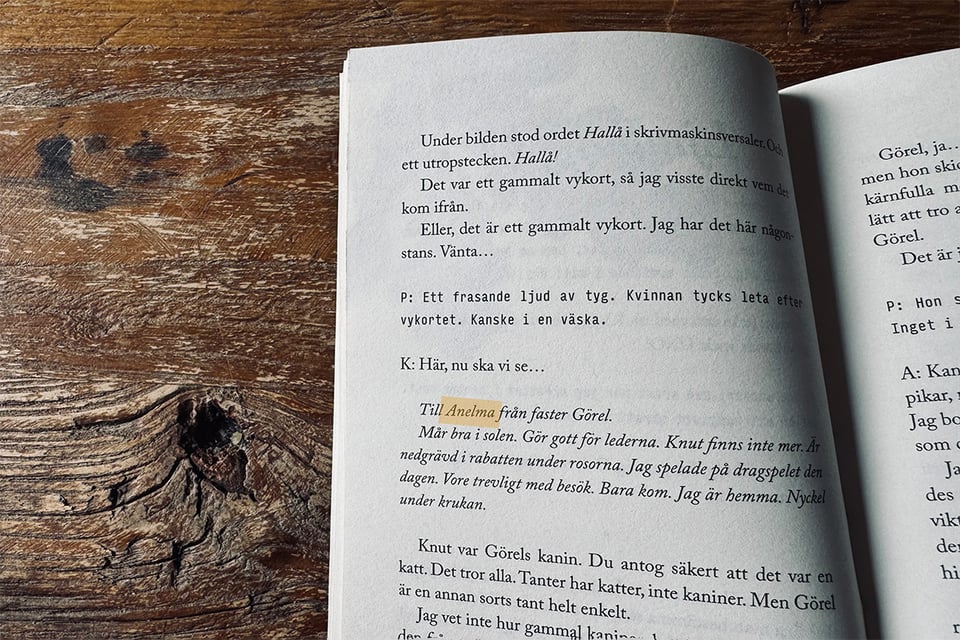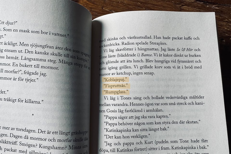 Man kan faktiskt hitta farmor i mina böcker. I formen av ett namn men också som en trevlig sysselsättning. Jag och farmor bollade dock inte vedervärdiga måltider mellan varandra – vi gav istället familjemedlemmar vedervärdiga namn. Kissebajskorv-Victor, Stjärtsvett-Stefan och Pruttsnor-Lotta. Typ så. Vi skrattade gott där vi låg i hennes säng innan läggdags.