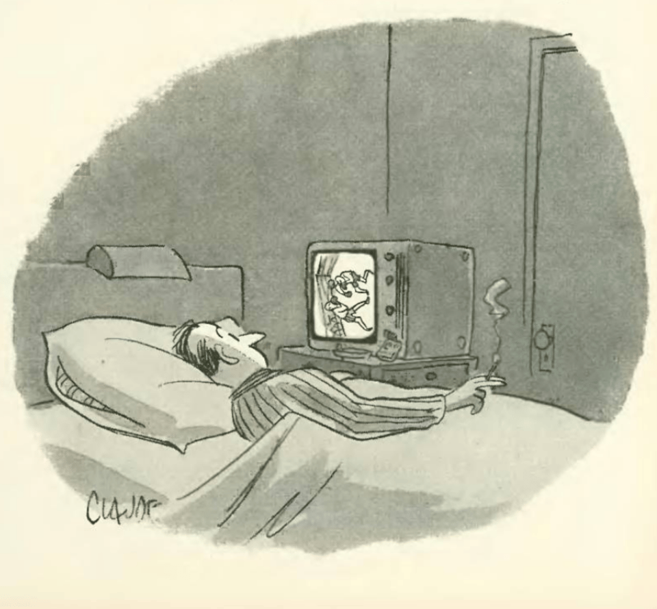Pg. 72: Captionless, real emotions in an absurd universe, intricate and well-composed drawing… this checks all my boxes, and while I didn’t chuckle I do think it hits at something latent, and I want to analyze it – something like: We overprepare our neotenic bodies to serve as imagined mythic figures, and find out too late that by the time we’ve stripped down to our vulnerable self, in heart undies, the room has gone cold – The Other, less prepared and thus more ready, scowls at us; we feel shame not just because we’re tardy but because our elaborate encumbrances fill the room.