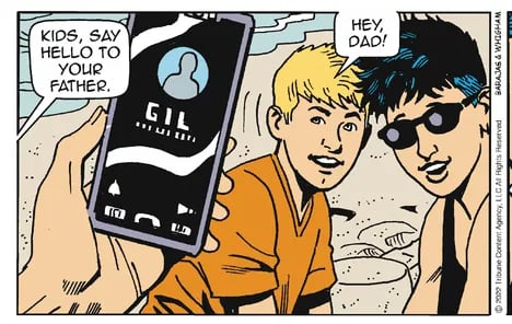 Today's strip is Gil Thorp's first interaction with his kids in 14 years. This is a family reunion. Comics make it possible.