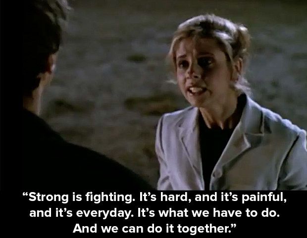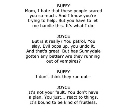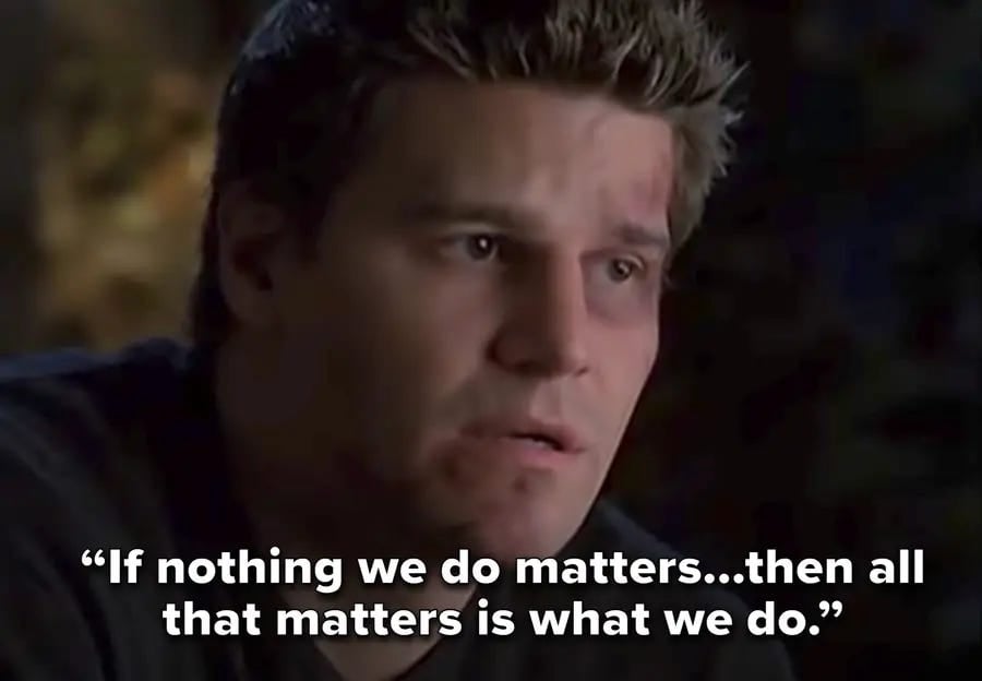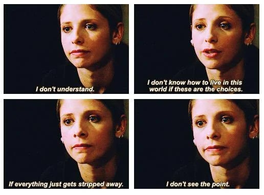 Buffy’s power/burden as the Slayer is to fight an ever-replenishing onslaught of vampires and demons for the rest of her life, which is expected to be nasty, brutish, and short, like all the other Slayers who came before her. That’s it. That’s her deal. There’s no interventionist God in Buffy, no guarantee that she’ll ever be rewarded for her sacrifices or that others will be punished for their evil. No higher power is calling the shots or steering the characters toward a predestined purpose. But in continually choosing to save others, often at great risk to her own life, Buffy (the character) creates her own guiding principles that shape a meaningful existence— and thus Buffy (the show) illustrates how we might live an examined life.