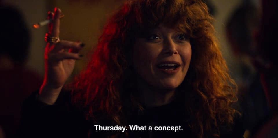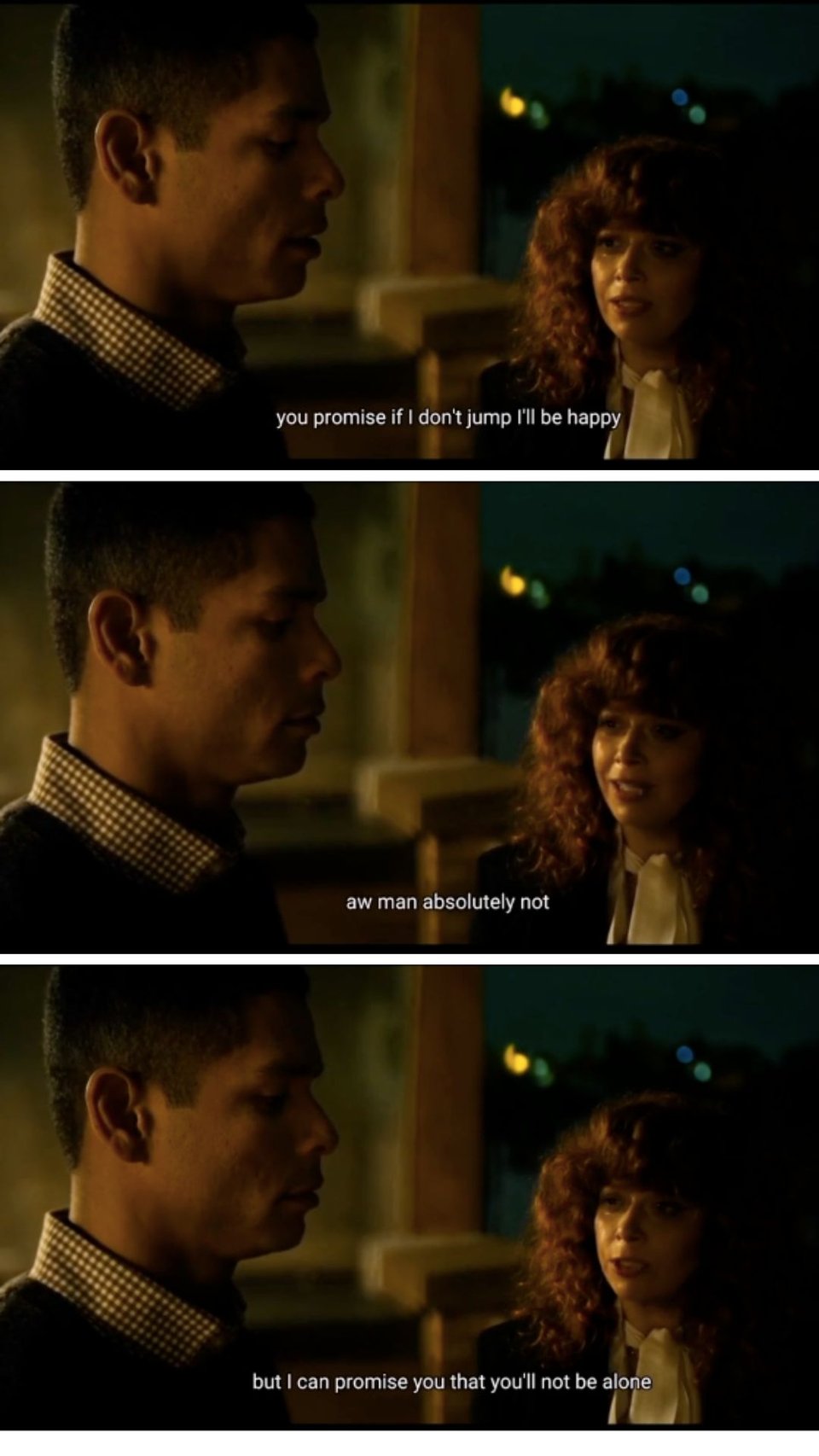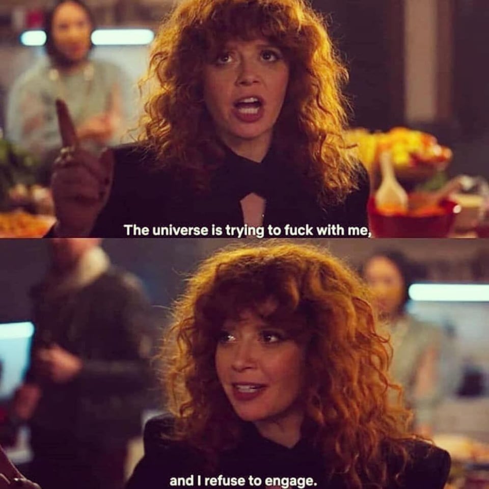 In Russian Doll, Natasha Lyonne dies over and over -by drowning, freezing, falling, car crash, gunshot, gas explosion - only to keep waking up at her 36th birthday party. She can’t escape this loop until she reaches out to Charlie Barnett, another character who is dying over and over, in the moment he’s about to jump off the roof of his apartment. Meanwhile, he can’t escape his own loop until he reaches out to her in the moment she’s about to make a destructive decision of her own. By interrupting each other’s self-annihilating choices, they free themselves from their purgatories.