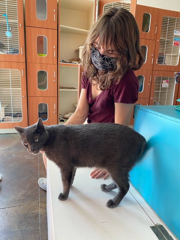 But when a six-year old stocky male cat with a short blunt tail belly-flopped in front of me and rubbed against my calves, the friend I’d brought with me said, “You’ve been chosen!” I had found the furry roommate to bring home.