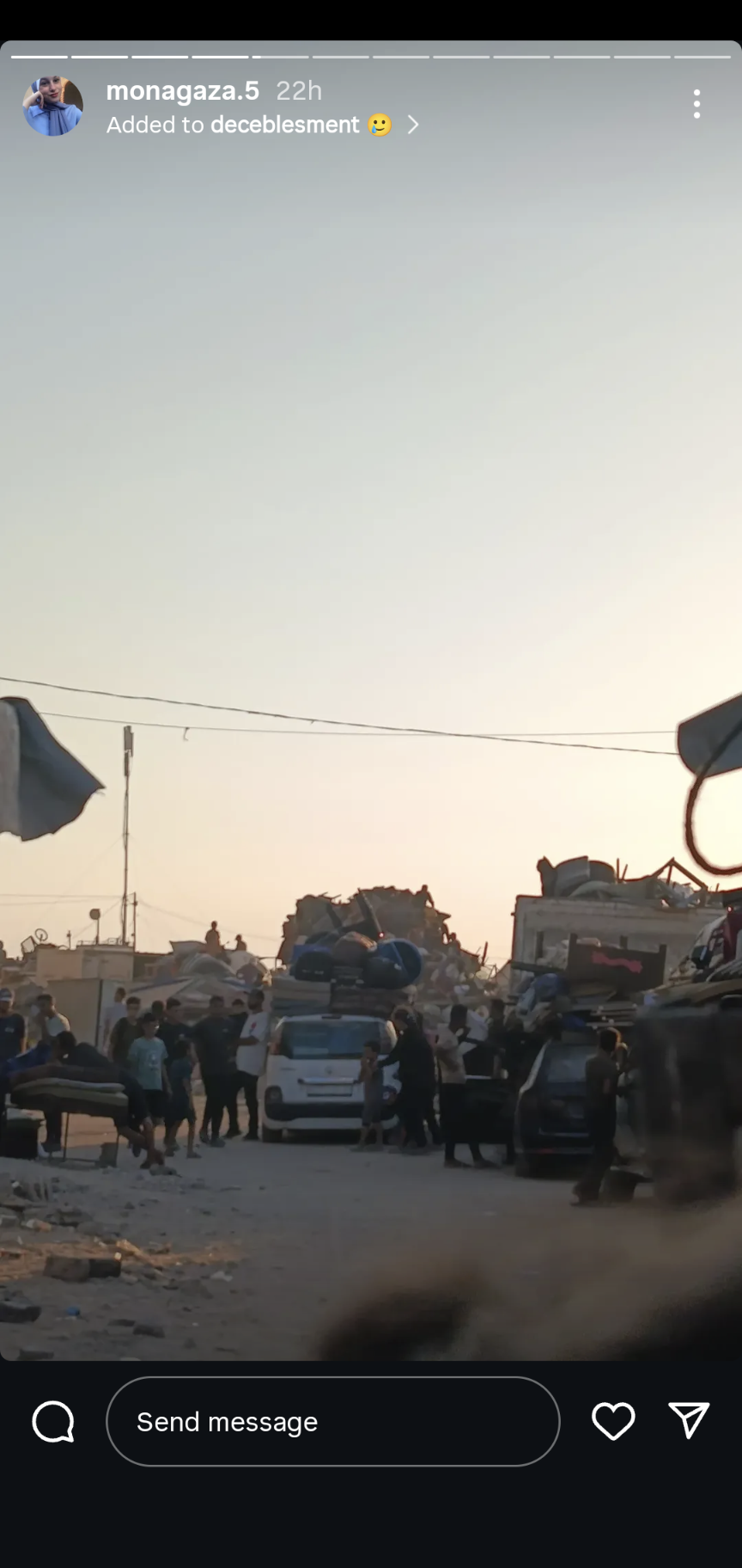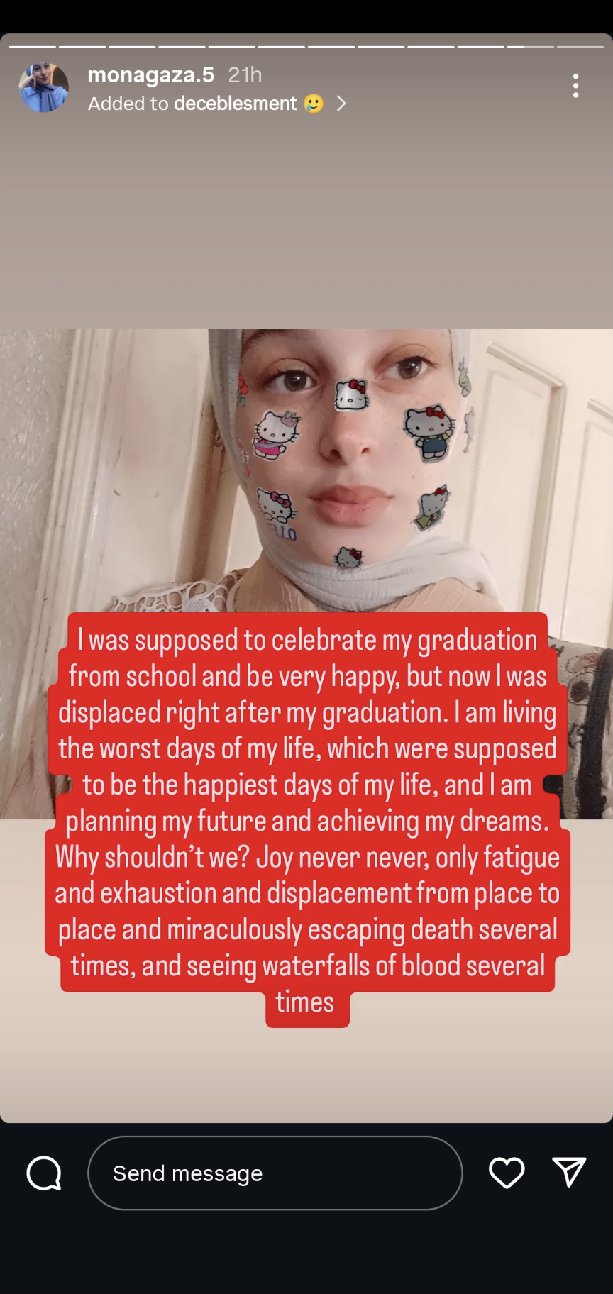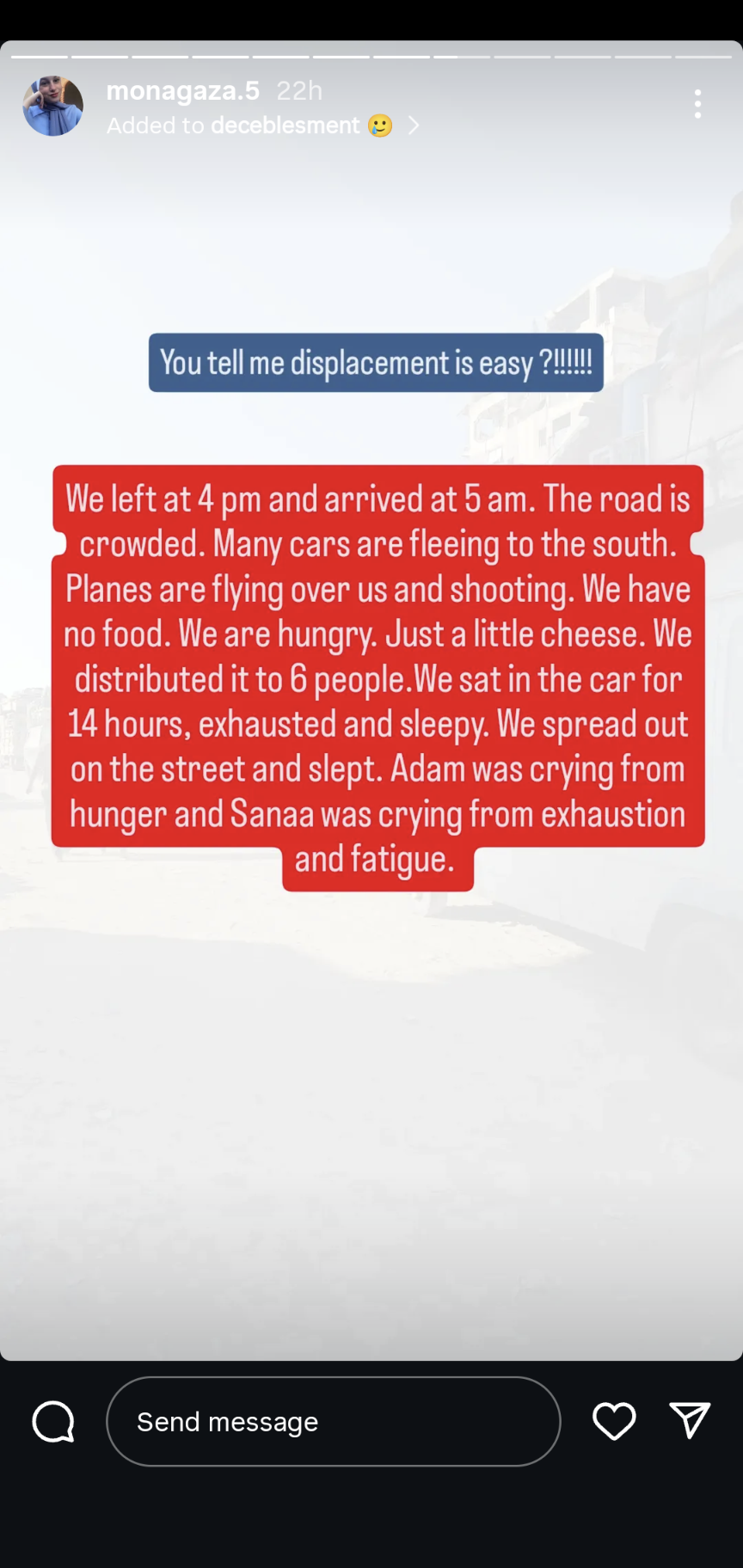 Mona, a young poet in Gaza I’ve been corresponding with, just had to evacuate her home in Gaza City. She should be celebrating her high school graduation now, and working on the novel she wants to publish someday. Instead, she and her family were forced to pile into a cramped, crowded van with what few belongings they could take with them, on a 14-hour drive to the south. Her Instagram stories chronicle the harrowing journey and constant fear.