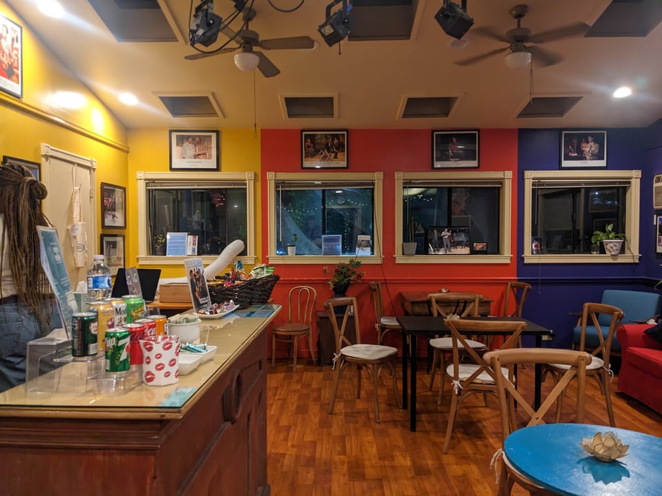 A side note to talk about how warm and cozy the theatre is. There’s an upstairs cafe that has a welcoming “San Francisco in the 90s” feel to it, a welcome reprieve to all the minimalist coffee shops in LA that feel like the Apple Store. And a balcony with bistro tables, string lights, and a view of the city.