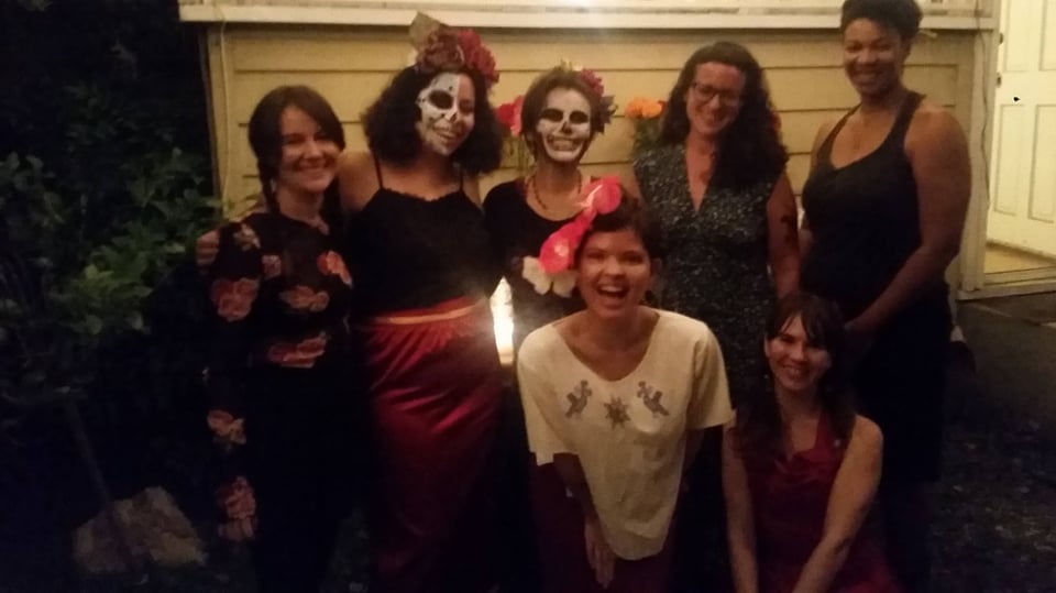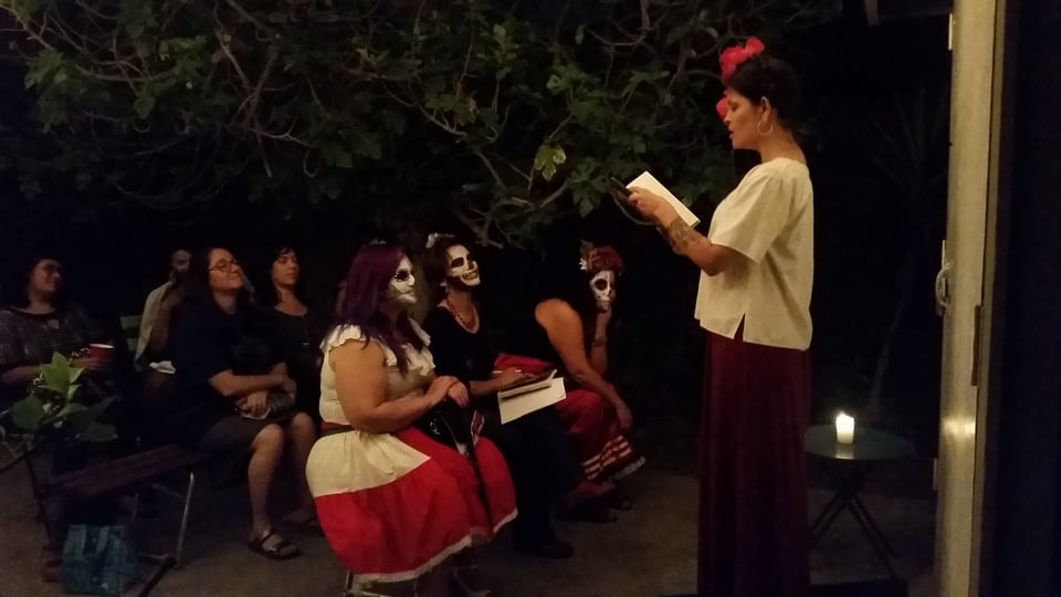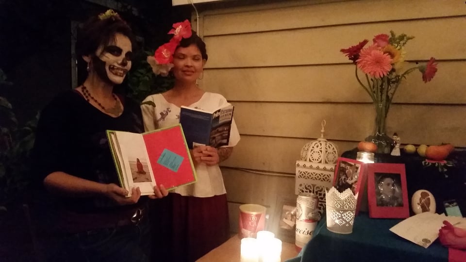 Ten years ago, Myriam and I met up at my corner bar to plan an outdoor reading. She suggested a November date and a Dia De Los Muertos theme. We invited readers and set up an altar. I strung up a garland of lights between my house and the storage shed. It was the first event of what I started calling the Pomegranate Reading Series.