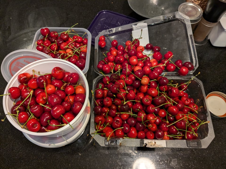That’s been supplemented by more community measures. I did my first fruit pick of the season — a cherry tree that was absolutely bowed with fruit — on a cool Friday night. We took over 70 pounds of fruit off it and probably left as much up there on the too-high branches, after going half an hour over time, because the sun was going down and eventually you just have to stop.
