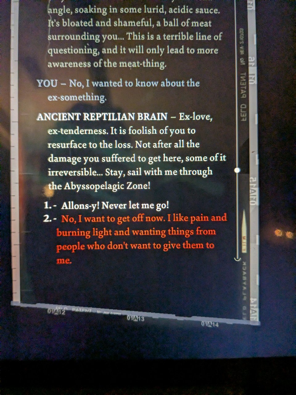 This is a beautiful piece of art, handling emotionally and socially fissile material in a way where it wasn’t just pretty, and wasn’t just narratively gripping, but — I could fall into it, and feel simultaneously quite wry about my own tendencies, but also laugh. It legitimately had me feel every emotional turn. I was, almost instantaneously, there. And by and large, around the one problem of that rampant piteous neediness and the ways it’s talking about something that I am quite sincerely sure is Men Talking Between Men About Man Stuff, I did this feeling as if I was in safe, perspective-bearing hands. Perspective is important, I think, in narrative: If you show you have some, you can get a lot more trust inherent from your readership, and Disco Elysium is almost nothing but perspective; perspective all the way down. The problem — and liberatory mechanism — of perspective.