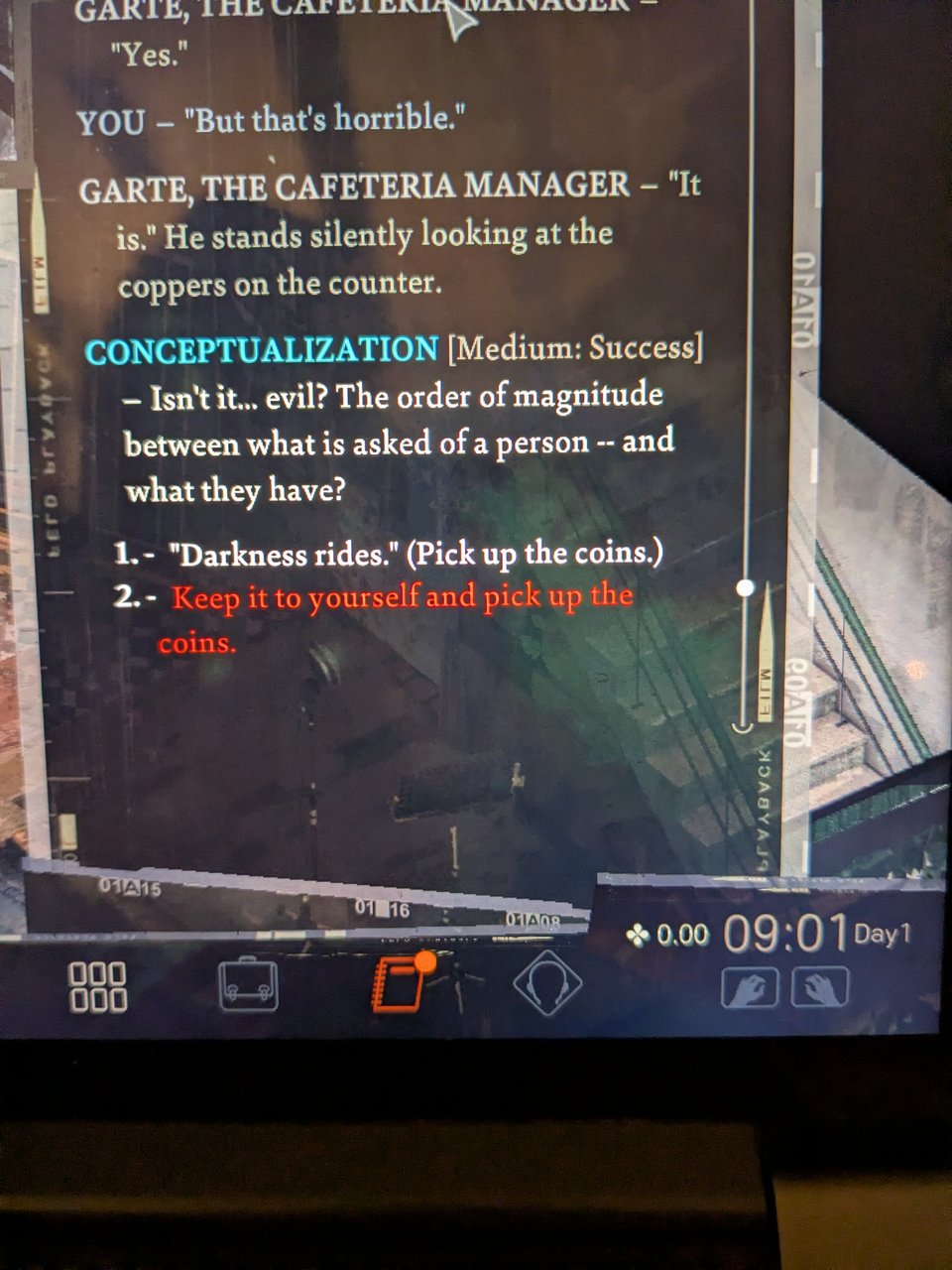 The lovely thing about your new partner, Kim, is that he’s a bit of a social lifeline/walking quiet hint system. He will pull you back when you’re doing something that he feels is a bad idea or going too far. He’s not always right; he’s not the voice of the game. He has some different priorities than you. But it’s very clear that on a basic level, though you’re pastless, disoriented, and a mess, you can foundationally trust him, and that’s quite powerful. You kind of know he’s actually got your back, as a character or a player. It’s an actually healthy relationship on many levels. In my first playthrough, I made my most mistakes during the afternoon Kim was off delivering the body to the morgue, and I was left to my own devices, doing way too much solo without my backup, on way too little information. I got in over my head so, so fast. I got smarter the second time. I did not do the important shit alone. This is not just game mechanics. This constitutes a parable.