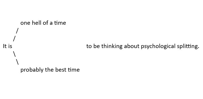 So it has been a hell of a time to spend most of a month running prep for all the things you’re going to do once people hit the end of their crisis cycle, trying to navigate and/or time up people’s crisis cycles, and thinking about psychological splitting. Or, to render that how it actually looks in my head?